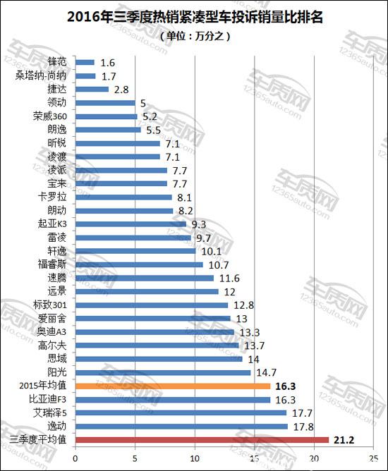 數(shù)據(jù)顯示,三季度國內(nèi)緊湊型車投訴銷量比平均值為萬分之21.2,是2015年整體車型投訴銷量比均值的1.3倍。不過部分車型投訴銷量比同樣處于較低水平,產(chǎn)品質(zhì)量可靠性堪稱出色,成為2016年三季度熱銷緊湊型車中質(zhì)量口碑的佼佼者。據(jù)統(tǒng)計(jì),三季度共有70款車型投訴銷量比低于同期緊湊型車平均值,且其中的27款車型銷量高于1.57萬輛(三季度緊湊型車平均銷量),這些熱銷車型的投訴銷量比表現(xiàn)如下: