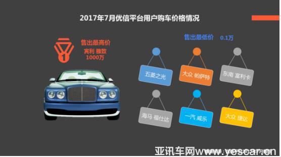 最后,我們再看看成交價方面。7月成交價最高為賓利雅致,售價高達(dá)1000萬元。與之相比,售價最低者僅為0.1萬元,兩者相差1萬倍之多。