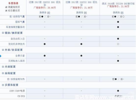 以售價(jià)21.99萬元的邁騰 2017款 330TSI DSG 領(lǐng)先款,和售價(jià)21.98萬元的速派 2016款 TSI330 智行版為例對(duì)比。為了更清晰的進(jìn)行比對(duì),特別增加了一款售價(jià)20.99萬元的邁騰 2017款 280TSI DSG領(lǐng)先型。