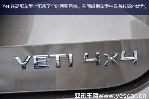 高性能:強(qiáng)悍動(dòng)力操控 在性能表現(xiàn)上,Yeti展現(xiàn)了硬派SUV的真本色,在高配車型中還配備了4X4全時(shí)四驅(qū)系統(tǒng),讓其擁有同級(jí)車型中首屈一指的動(dòng)力操控性和強(qiáng)悍的越野能力。