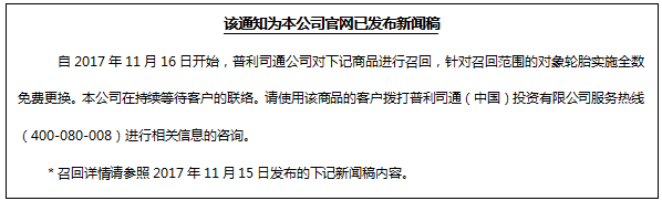 普利司通(天津)輪胎有限公司以客戶的安全、安心使用為最優(yōu)先考慮,我們決定主動實施召回。我們將授權(quán)普利司通(中國)投資有限公司對所有召回范圍內(nèi)的輪胎進行免費更換。對因此給客戶帶來的不便,我們深表歉意。
