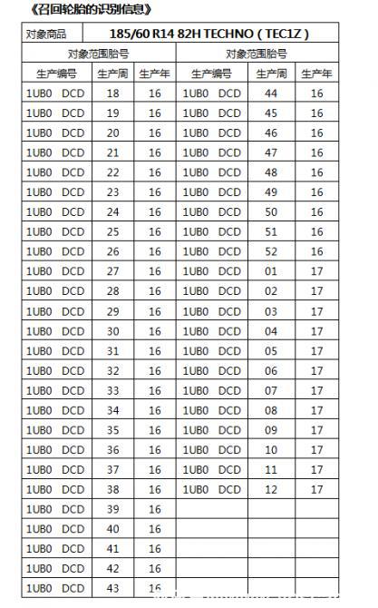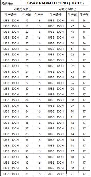 普利司通(天津)輪胎有限公司依據(jù) 《缺陷汽車產(chǎn)品召回管理條例》的相關(guān)規(guī)定,向國家質(zhì)量監(jiān)督檢驗檢疫總局備案了召回計劃。本次召回的輪胎是普利司通(天津)輪胎有限公司于2016年5月至2017年5月期間制造的普利司通品牌TECHNO系列乘用車輪胎的2個規(guī)格:185/60 R14 82H TECHNO(TEC1Z)、195/60 R14 86H TECHNO (TEC1Z),數(shù)量合計225,511條。