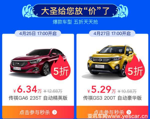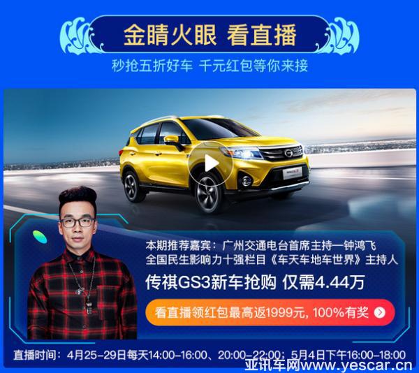 4月25日-29日每天14:00-16:00,20:00-22:00,5月4日下午16:00-18:00,更有六大網紅齊聚,帶你為大圣5.1省心車游季活動打CALL,現(xiàn)場直播秒車,廣汽傳祺GS3秒殺價低至4.44萬元,覆蓋廣大粉絲群體,大圣車服擊穿底價帶來超值優(yōu)惠。