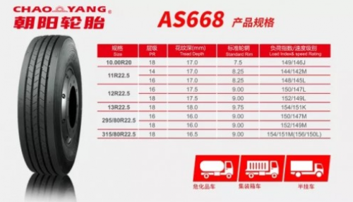 就以朝陽(yáng)輪胎AS668型號(hào)為例,這是一款適用面較廣的輪胎,能夠用于良好路面的中長(zhǎng)途各種車輛的導(dǎo)向輪、拖輪使用。它對(duì)于各個(gè)方面的性能都做出了優(yōu)化升級(jí):首先在外觀上,花紋塊外表面的圖案,增加了輪胎外觀新穎性。另外,它采用獨(dú)特的新技術(shù)降低了輪胎滾動(dòng)阻力系數(shù),能夠?qū)⒂秃拇蟠蠼档?;操控性能也更好。另外,朝?yáng)輪胎具有強(qiáng)大的抗?jié)窕芰白詽嵐δ埽毫骶€型淺溝及鋼片設(shè)計(jì),能夠打破濕滑路面水膜,將輪胎抗?jié)窕阅芴嵘?2%。此外,AS668也改善了接地壓力,花紋溝里的排石膠丁設(shè)計(jì)能夠避免溝底夾石,減少輪胎受損。
