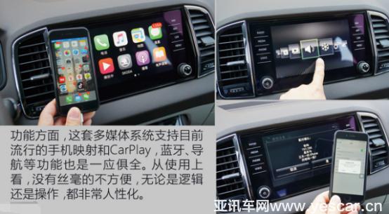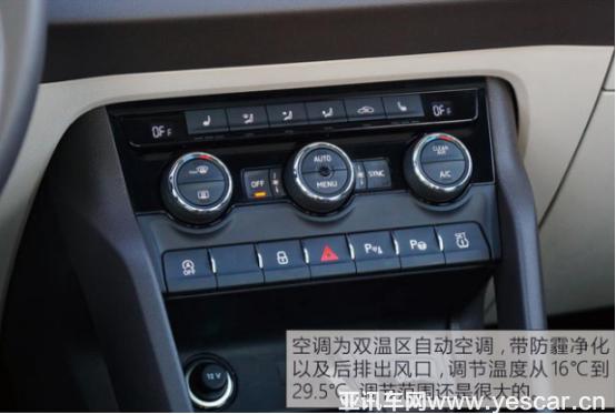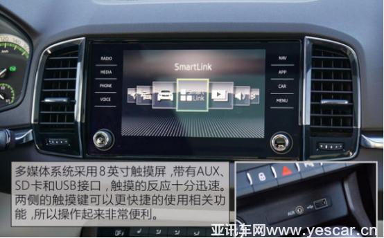 中控臺(tái)的整體設(shè)計(jì)非常友好并且親和力十足,簡單的錯(cuò)落排列,但功能化的劃分也十分明確。例如最上面的多媒體區(qū)域,8英寸觸摸屏比以前的斯柯達(dá)車型更大,兩側(cè)的快捷鍵采用觸摸式的操作,可以讓你方便的找到各種功能,在配置上也非常全面,映射、Carplay、藍(lán)牙和導(dǎo)航等一應(yīng)俱全。中間則是空調(diào)部分,圓形旋鈕使用起來更加直觀。最下面則是其他的一些功能按鍵,例如自動(dòng)泊車、胎壓監(jiān)測等。