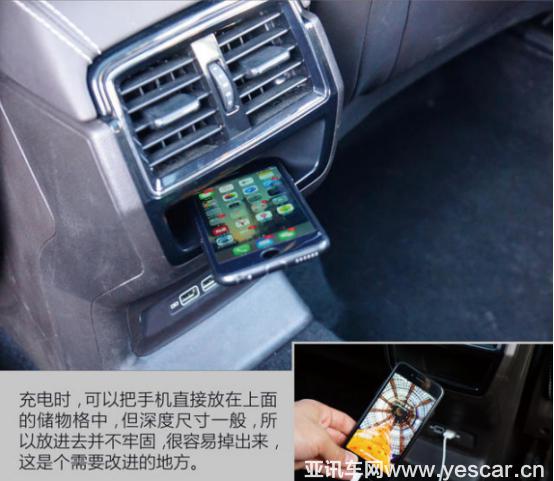 后排的儲(chǔ)物空間同樣是可圈可點(diǎn)的,包括扶手后面的儲(chǔ)物格,給手機(jī)充電的時(shí)候,手機(jī)就可以放在其中,只是空間深度一般,很有可能會(huì)掉出來。非??上У氖呛笈诺氖终肀蝗∠?,是不是可以在改款的時(shí)候加上,我們拭目以待。