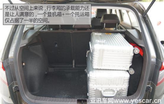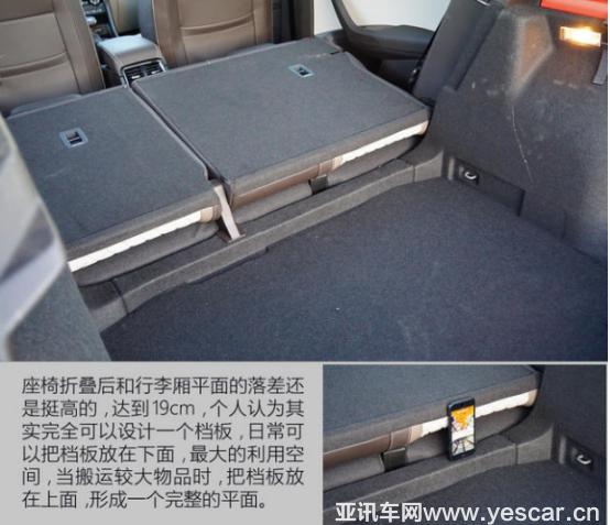 行李廂的空間非常規(guī)整,但非常可惜的是,即便把座椅折疊,也不能形成一個(gè)完整的平面,并且全系都沒有電動(dòng)尾門。座椅折疊后和行李廂平面的落差還是挺高的,達(dá)到19cm,個(gè)人認(rèn)為其實(shí)完全可以設(shè)計(jì)一個(gè)檔板,日常可以把檔板放在下面,最大的利用空間,當(dāng)搬運(yùn)較大物品時(shí),把檔板放在上面,形成一個(gè)完整的平面。不過從空間上來說,行李廂的承載能力還是讓人滿意的,一個(gè)登機(jī)箱+一個(gè)托運(yùn)箱僅占據(jù)了一半的空間。