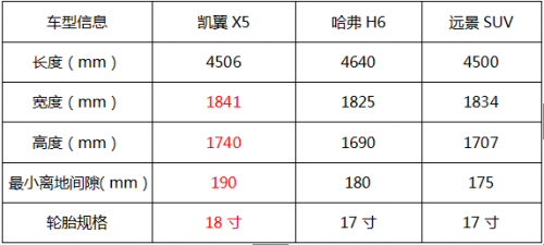 在車身尺寸上,三款車型中,哈弗H6最長(zhǎng),達(dá)到4640mm,但在寬度和高度上,凱翼X5均占優(yōu)勢(shì)。而且在體現(xiàn)SUV特性的最小離地間隙與輪轂大小方面,凱翼X5也超出了競(jìng)爭(zhēng)對(duì)手,190mm的最小離地間隙與18寸輪轂凸顯了良好的越野性能。190mm的超高通過性和600mm的強(qiáng)大涉水深度使得凱翼X5即使面對(duì)雨季時(shí)的積水路段也毫不畏懼。