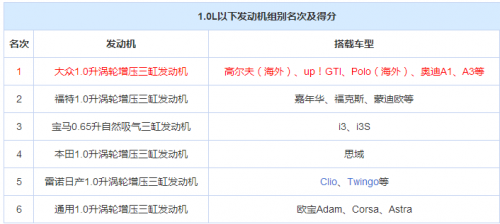 1.0L組得先說下冠軍得主大眾的1.0T三缸發(fā)動機,值得一說的是這款發(fā)動機是大眾2014年就研發(fā)出來的,只是一直沒有引進中國市場。不過據(jù)說今年年底將會在中國市場投放,這款發(fā)動機使用了目前在新一代三缸機中多項最新的代表性技術(shù),例如:輕量化的曲柄連桿機構(gòu)、集成式排氣管、分離式冷卻、電子執(zhí)行器渦輪等。