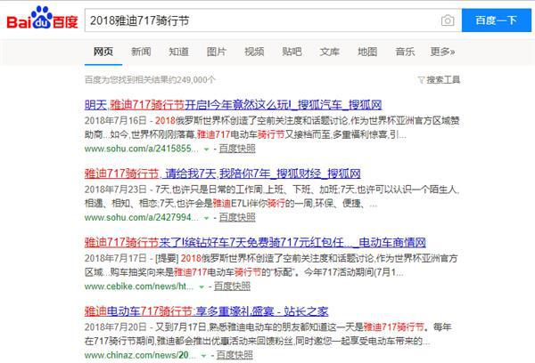 更值得一提的是,本次騎行節(jié),百度相關(guān)搜索量已逼近25萬;在今日頭條、騰訊等全國各大熱門資訊平臺,紛紛報道雅迪騎行節(jié),更是覆蓋千萬級受眾;另外,部分城市的特色騎行節(jié)活動也得到了當(dāng)?shù)仉娨暸_、紙媒等報道和關(guān)注,讓綠色出行的騎行理念得到全方位傳播。
