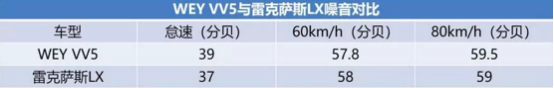 在怠速的情況下,VV5的噪音強(qiáng)度為39分貝,雷克薩斯LX的車內(nèi)噪音強(qiáng)度為37分貝;到了60km/h的工況下,在發(fā)動(dòng)機(jī)噪音增強(qiáng)以及胎噪介入后,VV5的車內(nèi)噪強(qiáng)度為57.8分貝,雷克薩斯LX的車內(nèi)噪音強(qiáng)度為58分貝,兩車依舊處于同一水平線;到了80km/h的車速情況下,VV5的車內(nèi)噪強(qiáng)度增加到了59.5分貝,而雷克薩斯LX的噪音強(qiáng)度小幅增加到了59分貝。