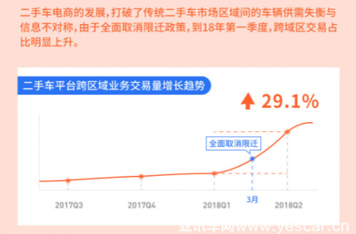 隨著取消二手車(chē)限遷政策的全面實(shí)行,二手車(chē)電商依托自身平臺(tái)屬性打破了地域空間限制,促使跨區(qū)域交易明顯上升。數(shù)據(jù)顯示,從2017年第四季度開(kāi)始,二手車(chē)電商平臺(tái)的跨域區(qū)交易占比開(kāi)始上升,2018年第二季度跨區(qū)域交易占比更是環(huán)比大幅上升29.1%。