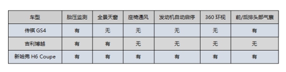 眾所周知,高配置一向是國產(chǎn)品牌與合資品牌抗?fàn)幍姆▽?,那么同是國產(chǎn)翹楚的傳祺GS4、吉利博越與新哈弗H6 Coupe相比實力如何呢?從下表可以清楚看出,車主一般較為關(guān)注的幾項配置新哈弗H6 Coupe一樣不差,而且在自動啟停、360環(huán)視、前/后排頭部氣囊等安全配置方面,新哈弗H6 Coupe也是誠意十足。