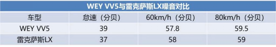 在怠速的情況下,VV5的噪音強(qiáng)度為39分貝,雷克薩斯LX的車(chē)內(nèi)噪音強(qiáng)度為37分貝;到了60km/h的工況下,在發(fā)動(dòng)機(jī)噪音增強(qiáng)以及胎噪介入后,VV5的車(chē)內(nèi)噪強(qiáng)度為57.8分貝,雷克薩斯LX的車(chē)內(nèi)噪音強(qiáng)度為58分貝,兩車(chē)依舊處于同一水平線(xiàn);到了80km/h的車(chē)速情況下,VV5的車(chē)內(nèi)噪強(qiáng)度增加到了59.5分貝,而雷克薩斯LX的噪音強(qiáng)度小幅增加到了59分貝。