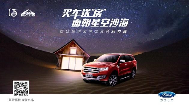 為回饋消費(fèi)者一直以來(lái)對(duì)福特撼路者的支持和喜愛(ài),特別推出買車送“房”,面朝星空沙海的活動(dòng)。凡在活動(dòng)期間(9月15日至10月31日)到店試駕撼路者的客戶均可參與抽獎(jiǎng)贏取千元好禮,訂車更有機(jī)會(huì)獲得直通阿拉善的VVIP特別大獎(jiǎng)禮包,包含雙人來(lái)回阿拉善交通費(fèi)用及星空小屋或房車的住宿權(quán)利。詳情請(qǐng)咨詢撼路者當(dāng)?shù)亟?jīng)銷商或關(guān)注福特撼路者官方微信平臺(tái)。