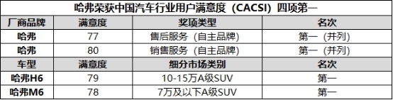但是,在哈弗看來,銷量只是品牌和用戶間情感聯(lián)系的“牽手”的環(huán)節(jié),要想讓兩者之間的聯(lián)系更穩(wěn)固,最終實(shí)現(xiàn)高滿意度,需要更深層的情感經(jīng)營。我們從獎(jiǎng)項(xiàng)可以看出,在銷售服務(wù)滿意度和售后服務(wù)滿意度兩個(gè)獎(jiǎng)項(xiàng)上,哈弗都拿到了第一。哈弗H6和哈弗M6在各自細(xì)分市場(chǎng)獲得的兩個(gè)第一,則是用戶綜合滿意度,實(shí)質(zhì)上涵蓋了5個(gè)維度:總體滿意度評(píng)價(jià)、性能設(shè)計(jì)評(píng)價(jià)、質(zhì)量可靠性評(píng)價(jià)、售后服務(wù)評(píng)價(jià)和銷售服務(wù)評(píng)價(jià)。也就是說,在總共5個(gè)維度上,哈弗H6和哈弗M6贏得了同級(jí)最高的用戶滿意度評(píng)價(jià)。