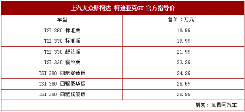 上汽斯柯達(dá)首款轎跑SUV科迪亞克GT已于廣州車展正式上市,新車推出3種動力共7款車型,售價(jià)18.99萬-26.99萬元。運(yùn)動氣質(zhì),燃情內(nèi)飾,充沛性能等等都是科迪亞克GT獨(dú)有的閃光點(diǎn),而這些亮點(diǎn)也讓科迪亞克GT成為都是青年新貴們購車首選。