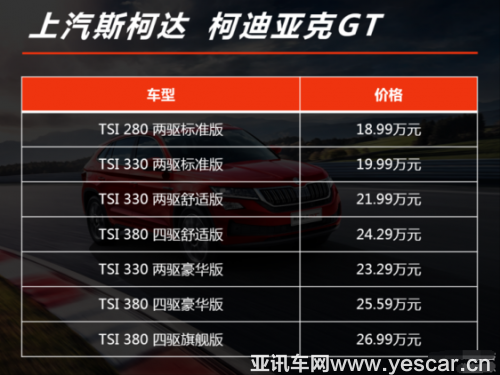 科迪亞克GT搭載了1.4T與高低功率版本的2.0T發(fā)動(dòng)機(jī),分別對(duì)應(yīng)280TSI、330TSI與380TSI的尾部標(biāo)識(shí),均匹配7速雙離合變速箱。官方百公里加速成績(jī)分別為10.1秒、8.9秒以及7.5秒。值得一提的是,新車均有國(guó)六排放標(biāo)準(zhǔn)的車型提供,今后在殘值率方面也有一定的保障。具體配置請(qǐng)見下表: