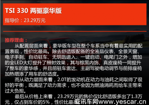綜上所述,在舒適版基礎(chǔ)上增加1.3萬元的豪華版車型性價(jià)比最高。至于動(dòng)力方面,相信大多數(shù)消費(fèi)者會(huì)選擇動(dòng)力與油耗都有著不錯(cuò)表現(xiàn)的TSI330車型。因此TSI 330 兩驅(qū)豪華版更值得推薦。