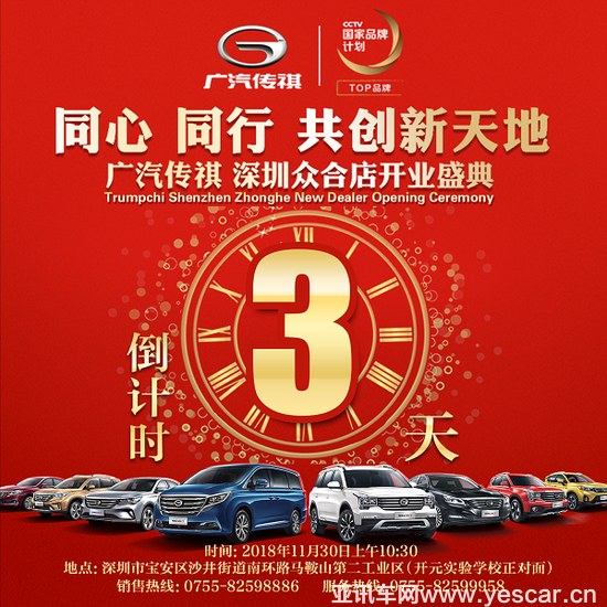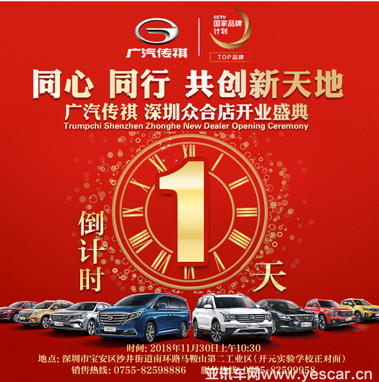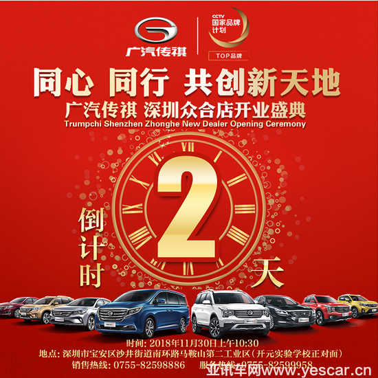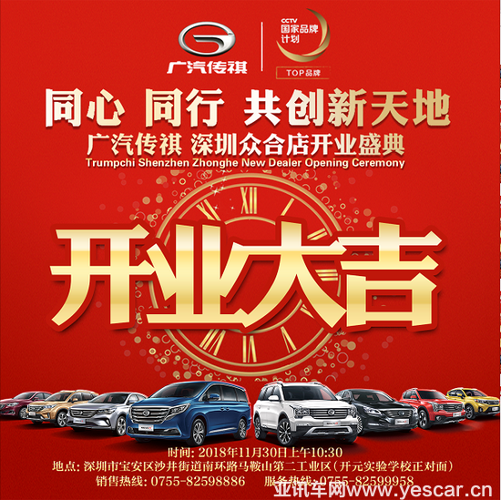 廣汽傳祺深圳眾合店開業(yè)時(shí)間定于2018年11月30日上午10:30分在深圳眾合店展廳舉行;我們誠摯邀請各界朋友蒞臨慶典現(xiàn)場,與我們一起見證傳奇,一起共創(chuàng)傳祺!