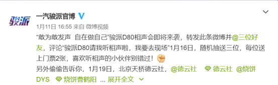 如果你是愛刷微博的德云粉絲,也可以在微博上參與抽獎活動。關(guān)注@一汽駿派官博,轉(zhuǎn)發(fā)相關(guān)微博并@三位好友并評論“駿派D80請我聽相聲啦,我要去現(xiàn)場”,即有可能獲得1月19日駿派D80相聲專場門票。抖音上同樣有我們的互動福利。關(guān)注@一汽-駿派抖音號,在相關(guān)作品下評論留言,即有機會獲得到近距離接觸德云偶像的機會!