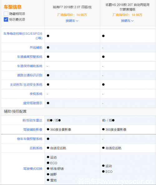 為了更好的進(jìn)行比較,我們選取了哈弗F7和名爵HS兩款15萬(wàn)元左右車(chē)型進(jìn)行對(duì)比,可以看出哈弗F7涵蓋了絕大多數(shù)的智能安全配置,像并線輔助、道路交通標(biāo)識(shí)識(shí)別、疲勞駕駛提示、倒車(chē)車(chē)側(cè)預(yù)警系統(tǒng)等。在同價(jià)位區(qū)間,相對(duì)于名爵HS,哈弗F7的安全配置更豐富一些,給消費(fèi)者帶來(lái)更安全的行車(chē)保障。