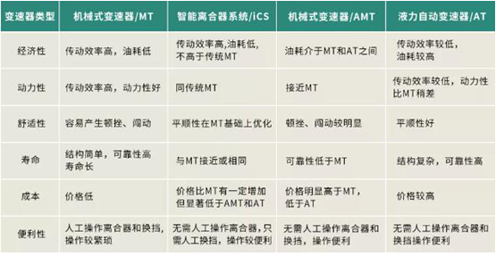 為了把ICS智能離合器的優(yōu)勢(shì)展現(xiàn)得更直觀,小編把它與MT、AMT、AT做了整理對(duì)比。