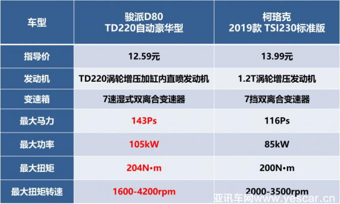 為了能夠有一個(gè)公平的對(duì)比,我們分別以價(jià)格相近的“駿派D80 TD220自動(dòng)豪華型”和“柯珞克2019款 TSI230標(biāo)準(zhǔn)版”做對(duì)比,兩款車型的官方指導(dǎo)價(jià)分別為12.59萬(wàn)和13.99萬(wàn),后者比前者貴了1.4萬(wàn)元,那么其在配置上能否超越駿派D80呢?