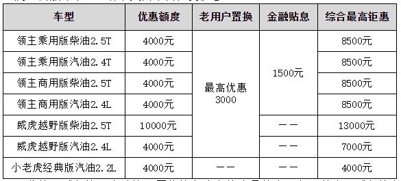 此次中興汽車“五一”鉅惠可謂力度空前,燃情十足,五重大禮各個有料,款款精彩。其中促銷大禮更是紅運來襲,旗下全系產(chǎn)品最高優(yōu)惠高達(dá)10000元,部分車型還有3000元老用戶置換及1500元金融貼息大禮相伴,諸如威虎越野版柴油2.5T車型綜合最高鉅惠將達(dá)到13000元。同時,領(lǐng)主乘用、商用版,小老虎經(jīng)典版等車型也將享受到不同程度優(yōu)惠。