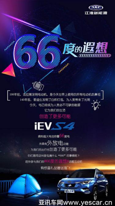 近期,江淮iEVS4開展了#66度的遐想#主題活動,網友們可以關注江淮汽車官方微博、江淮新能源微信公眾號,大膽打開腦洞,分享你對外放電功能的“奇葩”暢享,為新能源汽車的綠色生活加點“料”。