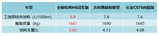 從上圖中算出的油重比數據可知,全新哈弗H6整備質量1661kg,油重比為3.65,在三款車型中數值最低,吉利博越整備質量1690kg,油重比數值最大為4.13,長安CS75整備質量1665kg,油重比數值為4.08。