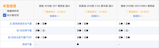 配置層面,我們以?xún)r(jià)格相近的三款車(chē)型進(jìn)行對(duì)比,分別是2019款別克君威20T尊貴型、2019款凱美瑞2.5G豪華版2018款雅閣260TURBO尊貴版