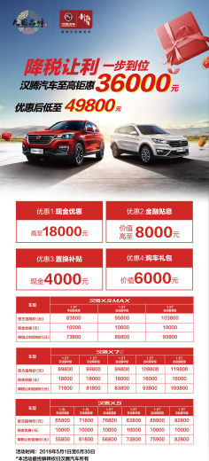 作為自主品牌的新生力量,漢騰汽車具備高度企業(yè)社會責(zé)任感,并積極響應(yīng)國家政策,不斷將實在優(yōu)惠帶給消費者。進(jìn)入2019年,漢騰汽車首先推出“汽車真下鄉(xiāng) 漢騰真補(bǔ)貼” 惠民政策;如今,在增值稅稅率下調(diào)之際,漢騰汽車宣布自5月1日起至6月30日期間開展“降稅讓利,一步到位”鉅惠活動,其中現(xiàn)金優(yōu)惠高至18000元,金融貼息價值至高8000元,更有4000元現(xiàn)金置換補(bǔ)貼以及價值6000元的購車禮包。該活動惠及旗下漢騰X7S、漢騰X5、漢騰X5 MAX 7座版三款市場熱銷車型等多達(dá)14個配置,綜合鉅惠可達(dá)36000元,部分車型優(yōu)惠后低至49800元。