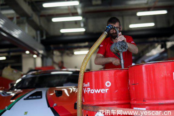 (維修車間,工作人員將殼牌V-Power能效燃油注入法拉利賽車)