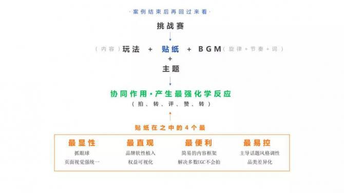 陳澎以商業(yè)化挑戰(zhàn)賽為例,解析了貼紙?jiān)谄渲械膽?yīng)用。商業(yè)化挑戰(zhàn)賽是通過(guò)融入品牌元素和獎(jiǎng)勵(lì)機(jī)制的 某種玩法示范 ,強(qiáng)引導(dǎo)用戶積極參與互動(dòng) , 實(shí)現(xiàn)品牌訴求的一種營(yíng)銷方式 。與商業(yè)化挑戰(zhàn)賽的結(jié)合,則讓貼紙更為高效的促進(jìn)品牌價(jià)值提升?!爸?題 + 玩 法 + B G M + 貼 紙是商業(yè)化挑戰(zhàn)賽的4大要素,其中貼紙可以起到平衡作用,在客戶需求與用戶喜好之間實(shí)現(xiàn)平衡,在硬性植入與藝術(shù)演繹之間實(shí)現(xiàn)平衡?!标惻旆窒淼?。
