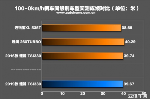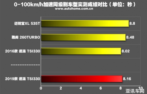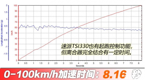 加速成績與之前的TSI330車型差距不大,因為同級很少有低功、中功、高功三種動力搭配,和同級高功的2.0T比它有點差距,但是和雅閣1.5T和凱美瑞2.5L這樣的車型比,它還是比較快的,也有起跑控制功能,不會浪費太多初始轉速。
