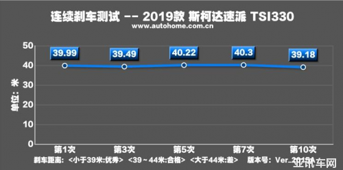 剎車成績也是同級別中大多數(shù)車型的表現(xiàn),舒適性取向的懸架也沒有太過分的點頭現(xiàn)象,而剎車腳感可能需要適應下,前段有一點點偏軟,而且制動力度比較大,這個要控制好。到了中后段剎車就算比較線性的了,連續(xù)幾組測試下來也沒有熱衰減現(xiàn)象。