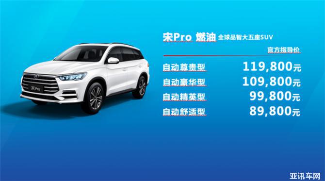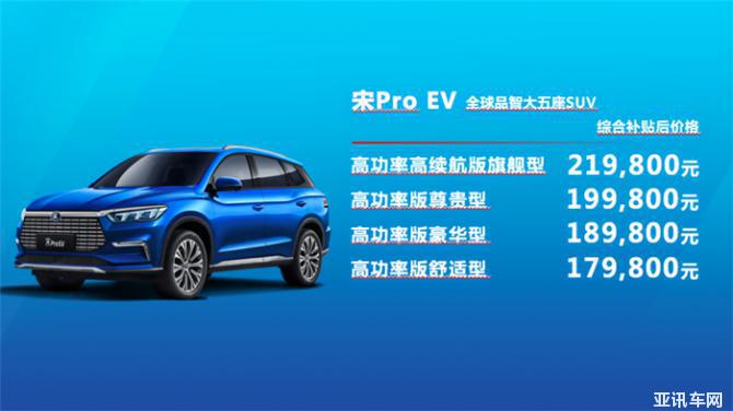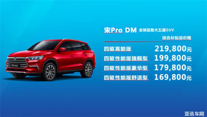 其中,宋Pro DM綜合補(bǔ)貼后價格:四驅(qū)高能版219,800元、四驅(qū)性能版旗艦型199,800元、四驅(qū)性能版豪華型179,800元、四驅(qū)性能版舒適型169,800元;宋Pro 燃油官方指導(dǎo)價:自動尊貴型119,800元、自動豪華型109,800元、自動精英型99,800元、自動舒適型89,800元;宋Pro EV綜合補(bǔ)貼后價格:高功率高續(xù)航版旗艦型219,800元、高功率版尊貴型199,800元、高功率版豪華型189,800元、高功率版舒適型179,800元。