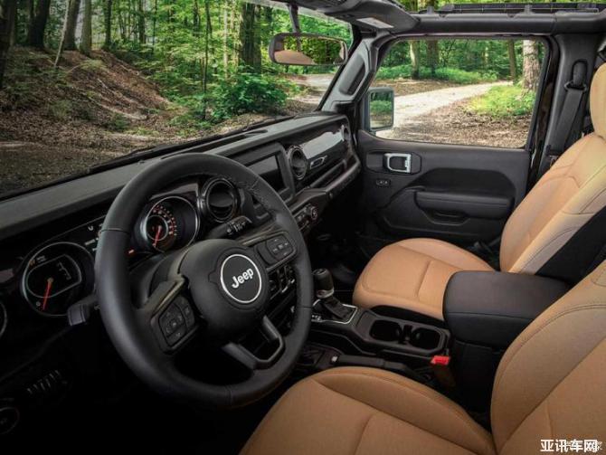 Black & Tan特別版從字面理解就是黑色和淺棕色版本,它使用了黑色的車漆以及淺棕色軟頂涂裝。新車型配備了側(cè)面的踏板,方便上下車,另外側(cè)面的車標(biāo)使用了黑色噴涂。輪圈規(guī)格同Willys特別版一樣是17英寸,配備全地形輪胎。內(nèi)飾同樣是黑色和棕色的搭配,座椅為織物材質(zhì),娛樂系統(tǒng)方面,該車配備了7英寸的液晶顯示屏。