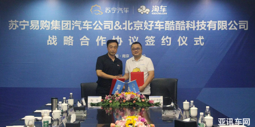 淘車高級副總裁任權(quán)(左)與蘇寧易購汽車公司總裁劉東皓(右)簽約