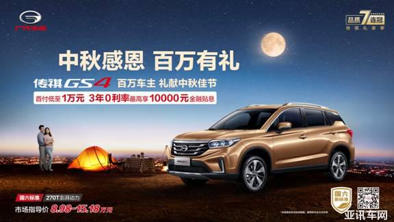 中秋佳節(jié)來臨,您是否期待一份福利滿滿的中秋大禮呢?深得百萬用戶喜愛的傳祺GS4,就為大家?guī)砹诉@份厚禮。超低的1萬元購車門檻,誠意豐厚的萬元貼息,讓更多用戶在這個美麗季節(jié),盡情暢享愉悅的出行樂趣。