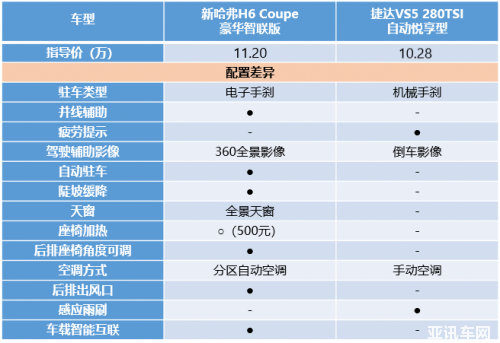 最后再看看配置,我們選擇指導(dǎo)價(jià)11.2萬的新哈弗H6 Coupe豪華智聯(lián)版與指導(dǎo)價(jià)10.28萬的捷達(dá)VS5 280TSI自動(dòng)悅享型進(jìn)行對(duì)比,不難看出,盡管二者價(jià)格相差不大,但前者還是豐富的多。
