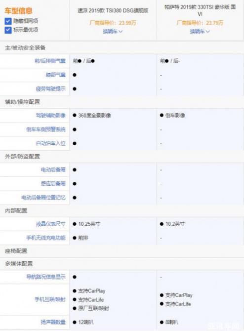 配置上,我們選取了價(jià)格相差不大的兩款車型進(jìn)行對(duì)比,一款是23.99萬(wàn)元的速派TSI380旗艦版,一款是23.79萬(wàn)元的帕薩特TSI330豪華版。兩款車在價(jià)格上雖然相差2000元,但是配置上,速派卻比帕薩特多出了不少配置,安全配置上有膝部氣囊、疲勞駕駛提示,輔助配置上有全景影像、一鍵泊車等很多功能,甚至還出現(xiàn)了很多合資車型上都沒有的無(wú)線充電這個(gè)配置,實(shí)用性和性價(jià)比都是速派更高一些。