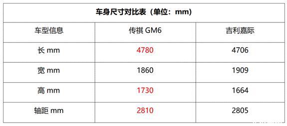 從整車尺寸來看,傳祺GM6的三圍(長、寬、高)分別是4780mm、1860mm、1730mm,軸距2810mm;吉利嘉際的三圍(長、寬、高)分別是4706mm、1909mm、1690mm,軸距2805mm;細(xì)致對(duì)比,傳祺GM6在整車長度、高度和軸距上都明顯更占優(yōu)勢(shì),我為此暗自竊喜。