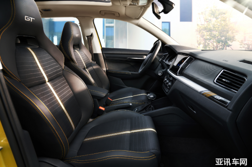 另外值得注意的是,柯米克GT的前排采用的是柯迪亞克GT上相似的一體式座椅,皮革+織物的用料搭配獨(dú)特的縫線設(shè)計(jì),頭枕處還標(biāo)有GT字樣。后排座椅同樣保留了類似的設(shè)計(jì)元素,視覺感官非常運(yùn)動(dòng)。