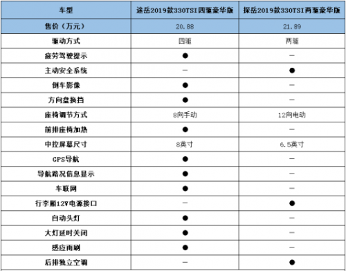 上圖為兩車的配置差異對(duì)比表,不難看出途岳和探岳兩款車型的配置都非常豐富,具體來看探岳330TSI兩驅(qū)豪華版在比途岳四驅(qū)豪華版貴10000多元的情況下,配置豐富程度卻不及途岳。尤其是四驅(qū)系統(tǒng)、倒車影像、前排座椅加熱、8英寸中控屏幕、車聯(lián)網(wǎng)、自動(dòng)大燈、感應(yīng)雨刷等重要配置在探岳身上并沒有看到,因此兩車在配置對(duì)比中,途岳的性價(jià)比更高。