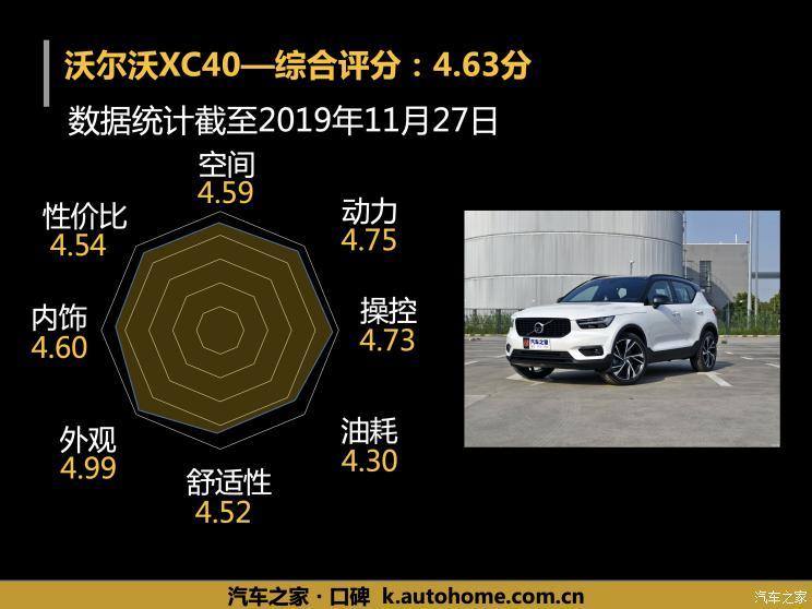 ● 沃爾沃XC40綜合評分:4.63分外觀一致好評,后排乘坐舒適性有所欠缺