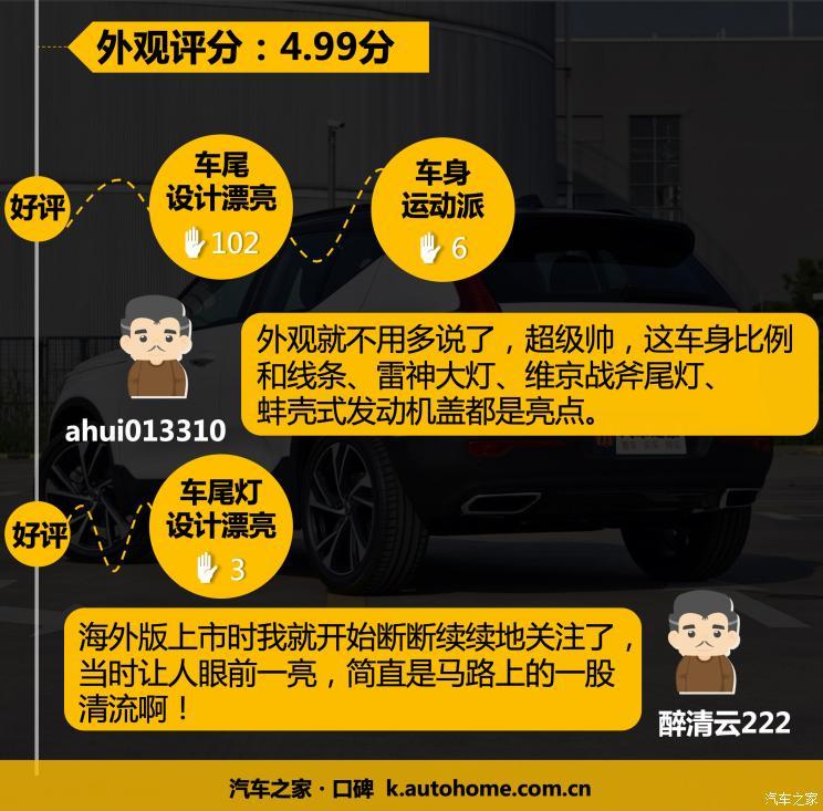 ● 沃爾沃XC40外觀評分:4.99分個性、顏值高、漂亮是它外觀的標(biāo)簽