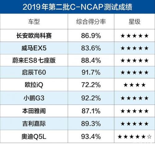 日前,2019年度C-NCAP第二批車(chē)型碰撞試驗(yàn)成績(jī)正式公布,參加本次碰撞試驗(yàn)的共有9款車(chē)型,分別為:長(zhǎng)安歐尚科賽、威馬EX5、蔚來(lái)ES8、啟辰T60、歐拉iQ、小鵬G3、本田雅閣、吉利嘉際和奧迪Q5L。不難看出,此批次電動(dòng)車(chē)占比很高,其中更是涉及到多個(gè)時(shí)下熱門(mén)的新勢(shì)力造車(chē)品牌,結(jié)合最近頻發(fā)的自燃事件也把電動(dòng)車(chē)安全問(wèn)題推到了風(fēng)口浪尖。最終蔚來(lái)ES8、威馬EX5以及吉利嘉際等7款車(chē)型獲得五星好成績(jī),奧迪Q5L更是以五星半的優(yōu)異成績(jī)拔得頭籌,具體的碰撞試驗(yàn)成績(jī)?nèi)缦?