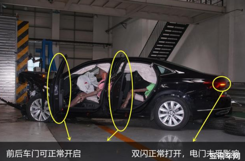 而側面碰撞中,帕薩特的B柱正常變形,但形變甚微,無撕裂。碰撞車車門表面出現(xiàn)一定程度的凹陷,但結構完整,車門鉸鏈牢固如初,所有車門均可正常打開。車內(nèi)側面氣囊和頭部氣簾完全展開,沒有局部未展開等失效現(xiàn)象。同時假人姿態(tài)穩(wěn)定,無扭曲或傾倒,側面胸腹部沒有與車內(nèi)零件直接接觸跡象。值得一提的是,碰撞后的車輛沒有失電現(xiàn)象,雙閃功能正常開啟,有效避免了二次事故發(fā)生。
